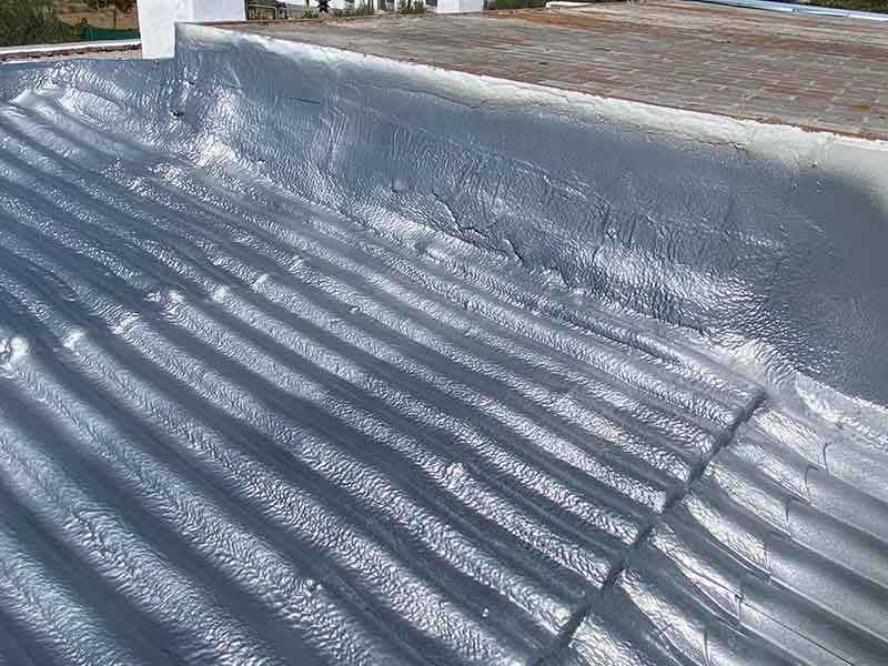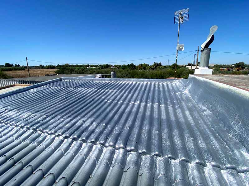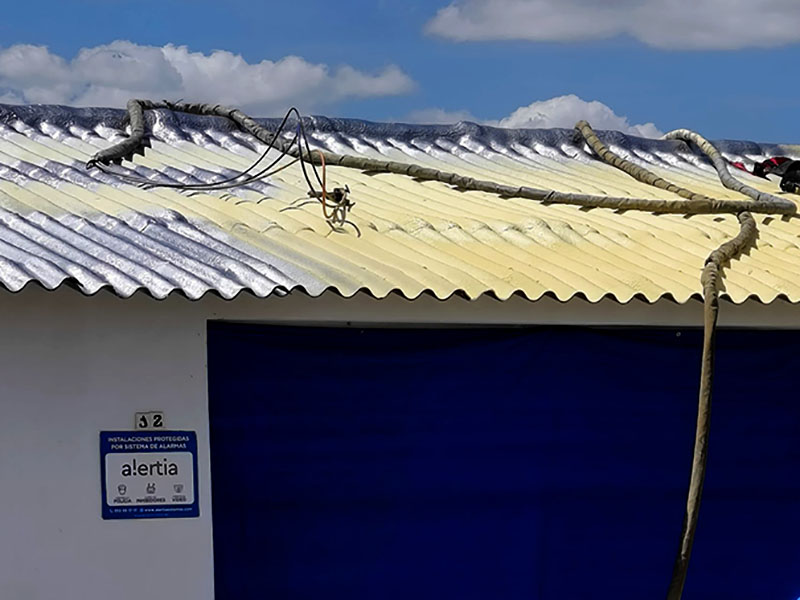 En cubiertas metálicas, la espuma proyectada puede utilizarse en determinados casos, siempre que el soporte lo permita y tras una correcta preparación. No obstante, el sistema más habitual y eficaz es la aplicación directa de poliurea, que actúa como impermeabilizante y protector.