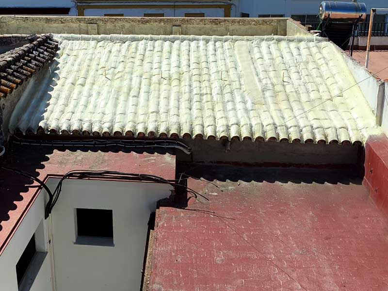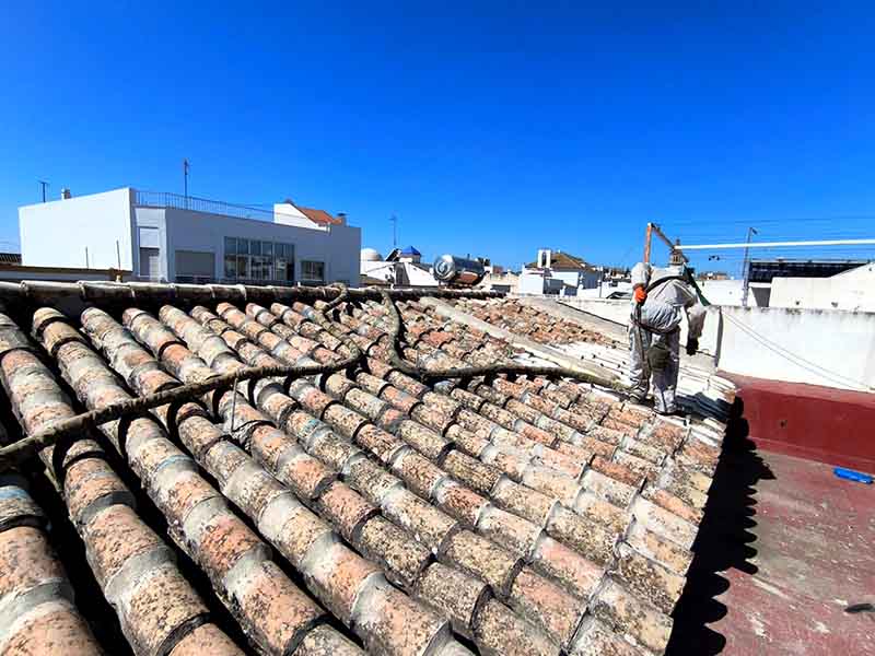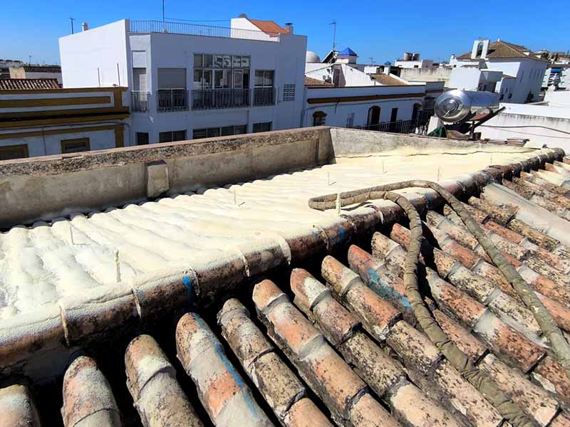 Una vez el tejado está reparado, se procede a la aplicación de espuma proyectada, un material con excelentes propiedades térmicas que se adapta perfectamente a la geometría de las tejas. La espuma crea una capa continua que: